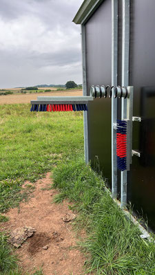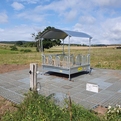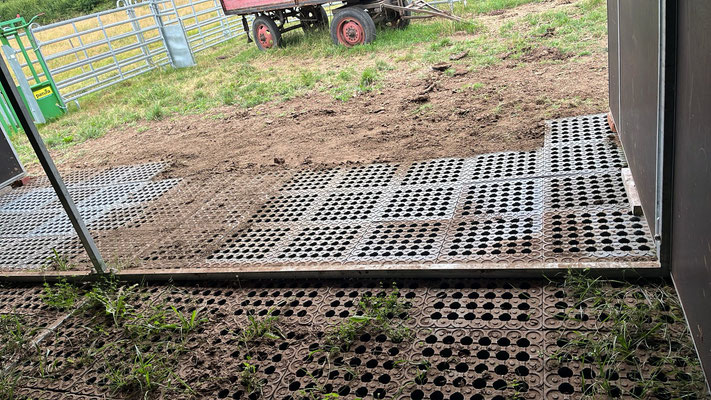 Um das "Zertreten" der Wiese bei nassen Wetter um die Heuraufe herum zu verhindern, sind im "Standbereich" Paddocklplatten verlegt worden, die das "Einsinken" der Rinder in den Boden verhindern. Auch in den Unterständen befinden sich jetzt diese Platten und die Böden sind daher "trittfest".