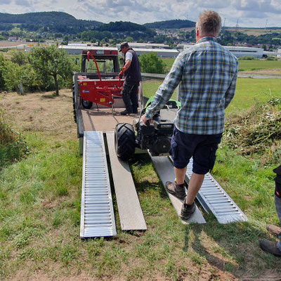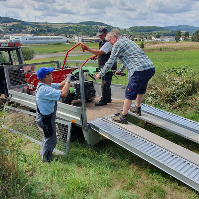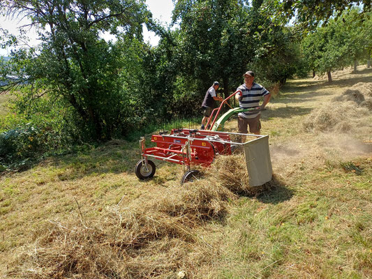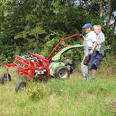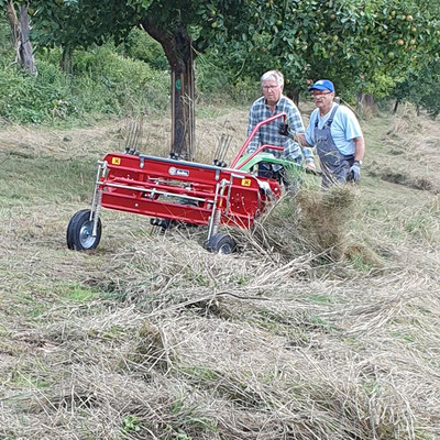 Und damit begann der Höhepunkt des Arbeitseinsatzes: der erste Einsatz des Morellato, ein Schwader, der vom Mondo angetrieben wird und zum Einsatz zwischen den Bäumen eingesetzt wird. In unebenen Gelände sind zwei Leute zur Bedienung sinnvoll, ob auf ebenen Gelände eine Person zur Bedienung ausreicht, muss sich noch erweisen. Das Arbeitsergebnis des Morellatos war zufriedenstellend. Das Mähgut kann gut aus dem Bereich zwischen den Bäumen in die Gasse zwischen den Baumreihen zum Pressen befördert werden. Zum Heuwenden ist das Gerät eher nicht geeignet.