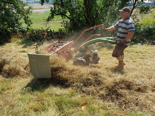 Für Gerd fing der Arbeitseinsatz am Mittwoch (6.8.2025) früh an. Als der erste Helfer kurz nach neun Uhr eintraf, hatte er schon einiges auf der Hardt mit dem Traktor und Mähwerk gemäht. Später kam dann auch der Mondo mit Mähbalken von Peter bedient, dazu. Anschließend wurde das Schnittgut gewendet.