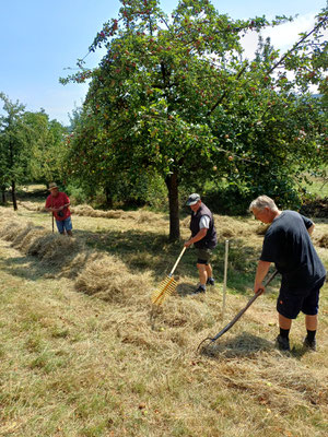 Heuwenden und das "Herausgabeln" zwischen den Bäumen stehen für den Folgetag auf dem Programm.
