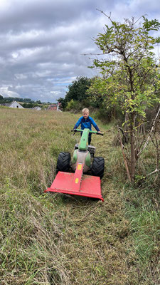 Am Montagvormittag (16.6.2025) war der Traktor mit Balkenmäher dieses Jahr erstmals im Einsatz. Sowohl die Wiese Groß als auch die Taufwiese wurden nach der Entfernung des Jakobskreuzkrautes - auf der Großwiese wurde keine dieser Pflanzen entdeckt, auf der Taufwiese waren es wenige - gemäht. Auf der Taufwiese kam auch der Mondo für die Bereich zwischen den Bäume zum Einsatz.