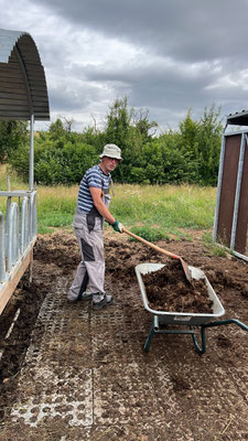 Am heutigen Samstag (12.7.2025) wurden die Paddockplatten rund um die Heuraufe entmistet. Anschließend legte Gerd unter dem "Vordach" des neuen Viehunterstandes die noch vorhandenen Paddockplatten aus. Beides zum Wohl unserer tierischen NATURSCHUTZ - Mitarbeiterinnen.