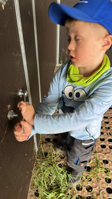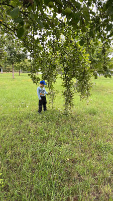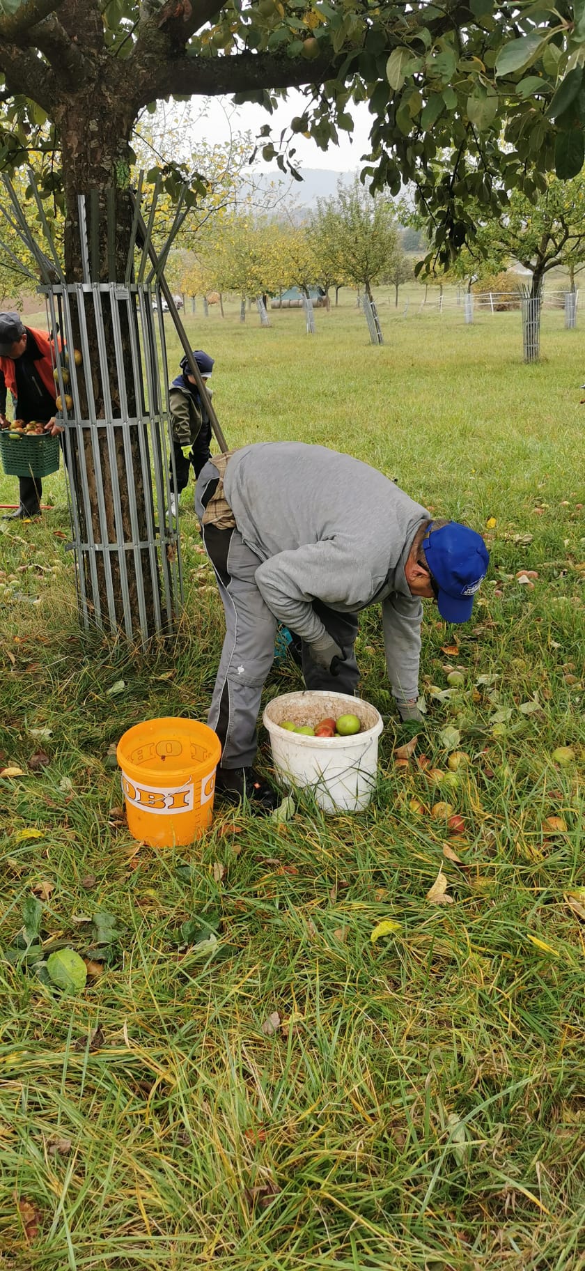 Julian wurde am 29.7.2025 an Reparatur- und "Vorsorge"arbeiten herangeführt. Zum einen musste eine Kratzbürste am Unterstand der Rinder repariert werden, zum anderen mussten auf der Taufwiese "überlandene" Apfelbäume enlastet werden. Die Äpfel wurden sowohl mit der Hand als auch mit der Rüttelstange entfernt.