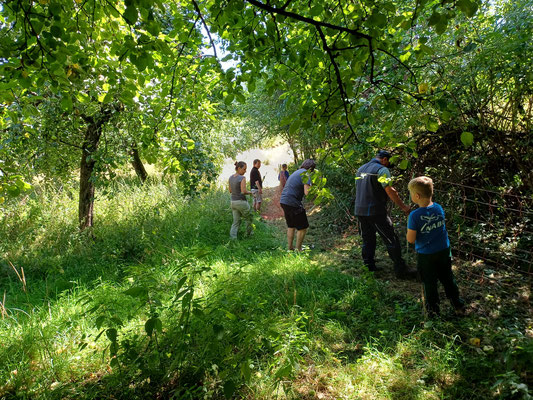 Außerdem war deutlich sichtbar, dass die Apfelbäume total "überladen" sind, Äste teils bis fast auf den Boden hängen und daher die geplante Mahd am Mittwoch nur schwer umsetzbar ist. Deswegen wurden am Dienstag Äste gekürzt, abgebrochenes und abgesägtes Holz entfernt und damit der Weg für die erforderlichen Maschinen bei der Mahd bewältigbar gemacht. Hier waren in der Spitze nur vier Aktive im Einsatz. Daher war die Arbeitsdauer schon deutlich länger.
