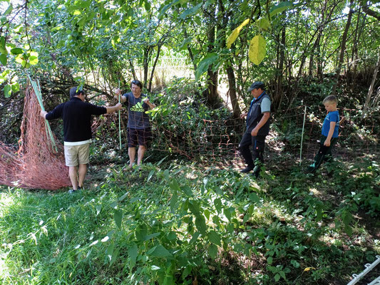 2. und gleichzeitige 3. Phase: Drei Leute bauten einen kleinen Zaun mit Litzen zwischen "Teichbereich" und "Wiesenbereich" im Gelände des Damshäuser Areals auf. Ein Litzenhalter wurde neu angebracht und zwei Erdungspfähle eingeschlagen und angeschlossen.