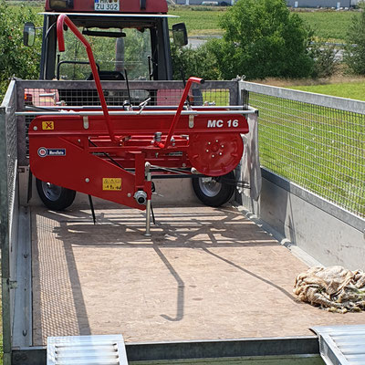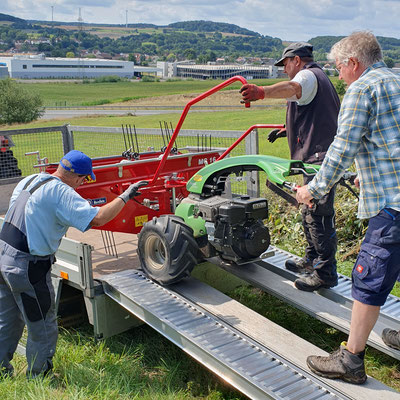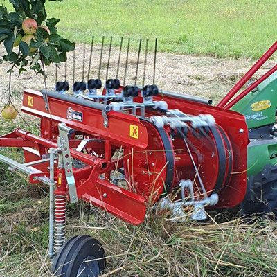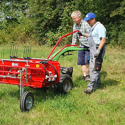 Der neue Vorsatz für den Mondo ist da. Mit diesem Gerät kann sowohl das Heu gewendet als auch geschwadert werden. Das mühsame Rechen mit der Hand auf der Taufwiese, um das Heu zum Pressen aus dem Bereich zwischen den Bäumen in die "Gasse" zwischen den Baumreihen zu befördern, sollte somit der Vergangenheit angehören.