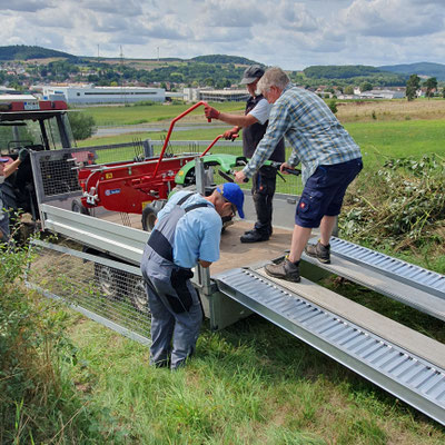 Gerd hatte angeboten, das Einholen der Heuballen mit dem Frontlader/Traktor auf der Hardt zu Übungszwecken für Interessierte zu nutzen. Christian mit Sohn Frederick sowie Julian haben dann unter der Mithilfe von Gerd nochmals 47 Heuballen auf den Einachshänger aufgeladen, zur Halle gefahren und dort gestapelt. Abschlussfeststellung von Gerd:
