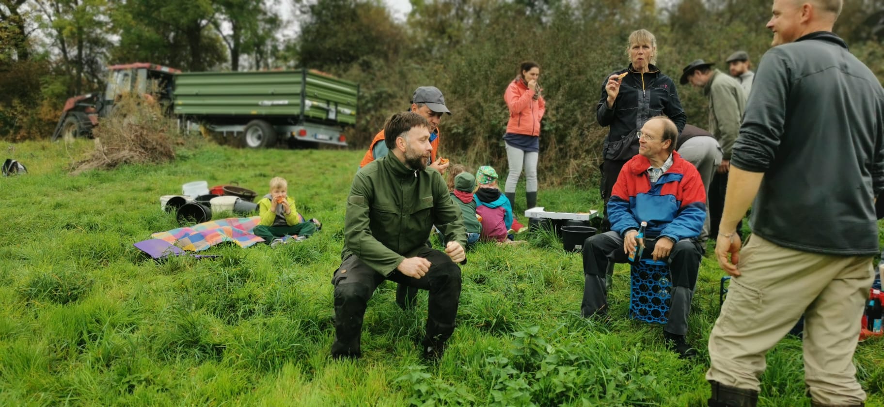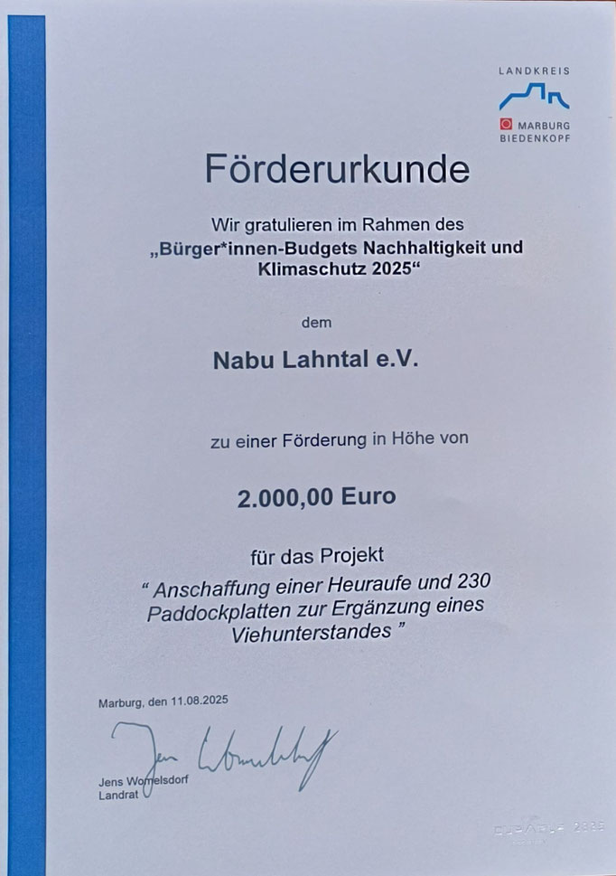 Mit finanzieller Unterstützung des "Bürger*innen-Budgets Nachhaltigkeit und Klimaschutz 2025" des Landkreises konnten eine 2. Heuraufe und Paddockplatten angeschafft werden. Zur Aufstellung der Heuraufe und der Verlegung der Paddockplatten fanden sich am Samstag (23.8.2025) neun Erwachsene und zwei Kinder ein. Nach Eineinhalb Stunden war diese Arbeit geschafft. Die große Anzahl der Aktiven machte es möglich, dass auch noch der Zaun um die Sumpfwiese freigeschnitten werden konnte.
