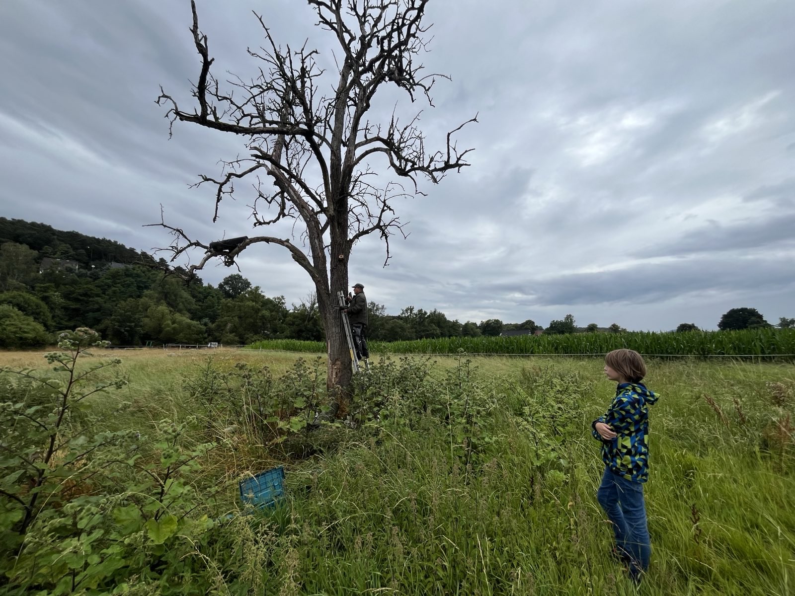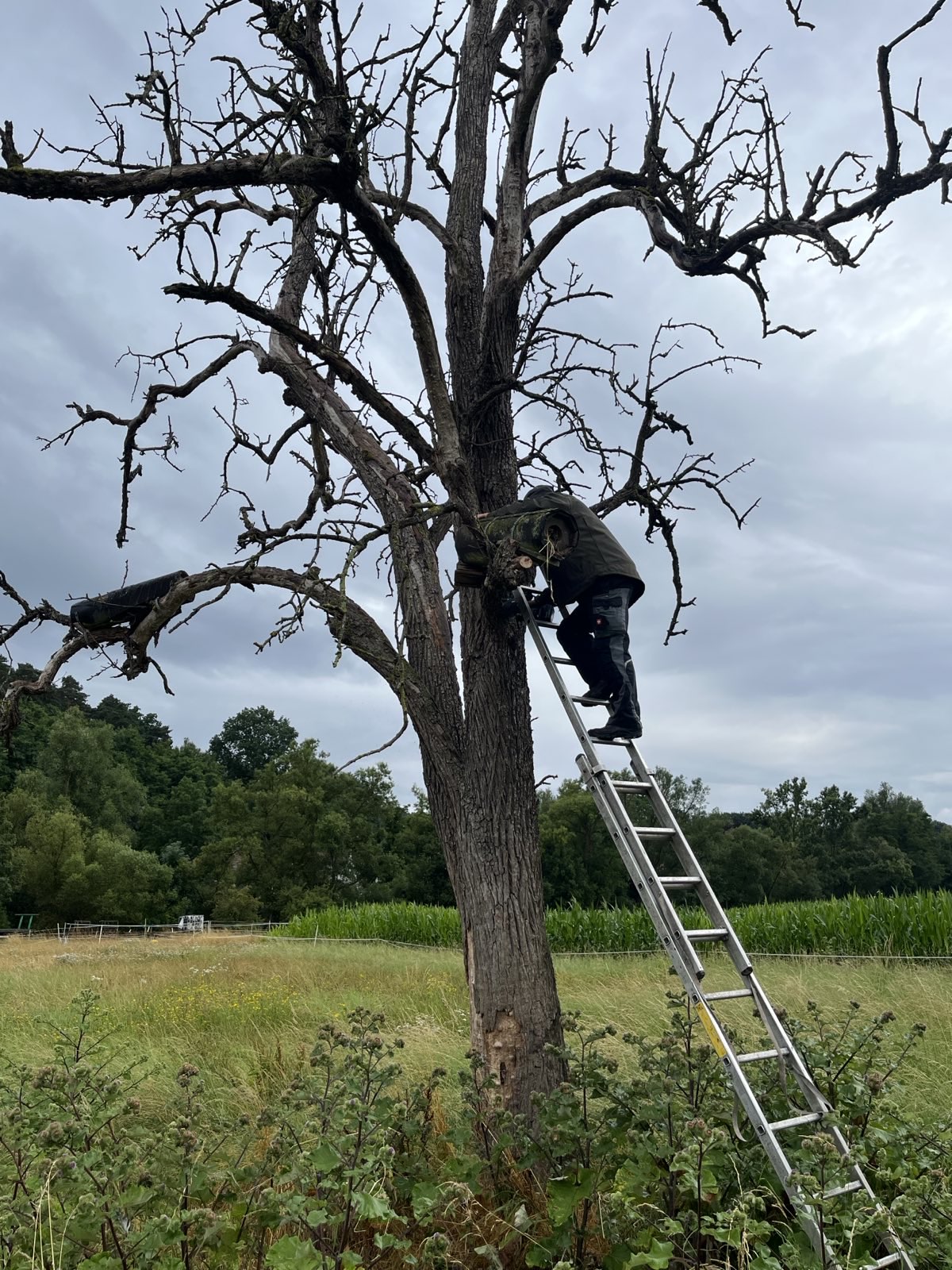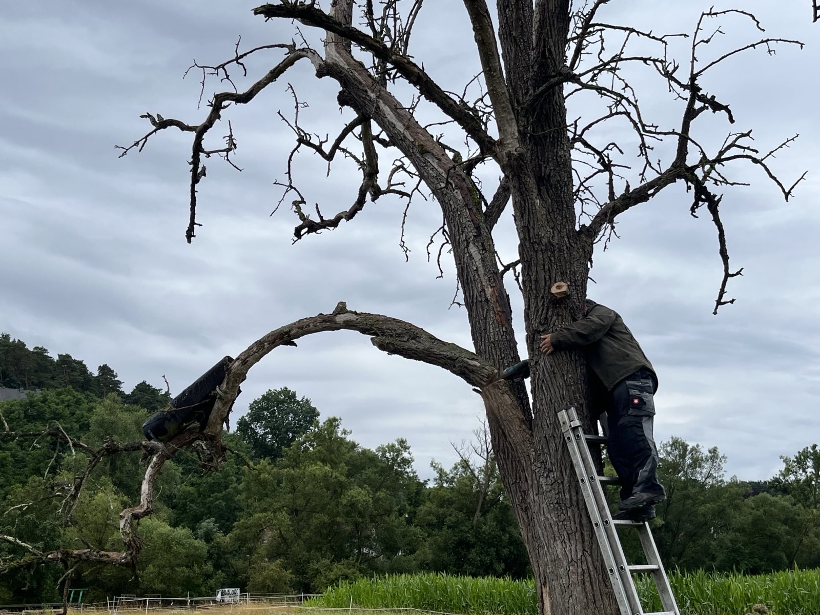 Aus Sicherheitsgründen wurden zwei Steinkauzröhren von abgestorbenen Ästen/Bäumen von Jakob, Julian und Gerd am 16.7.2025 aus der Wiese Scheel entfernt.