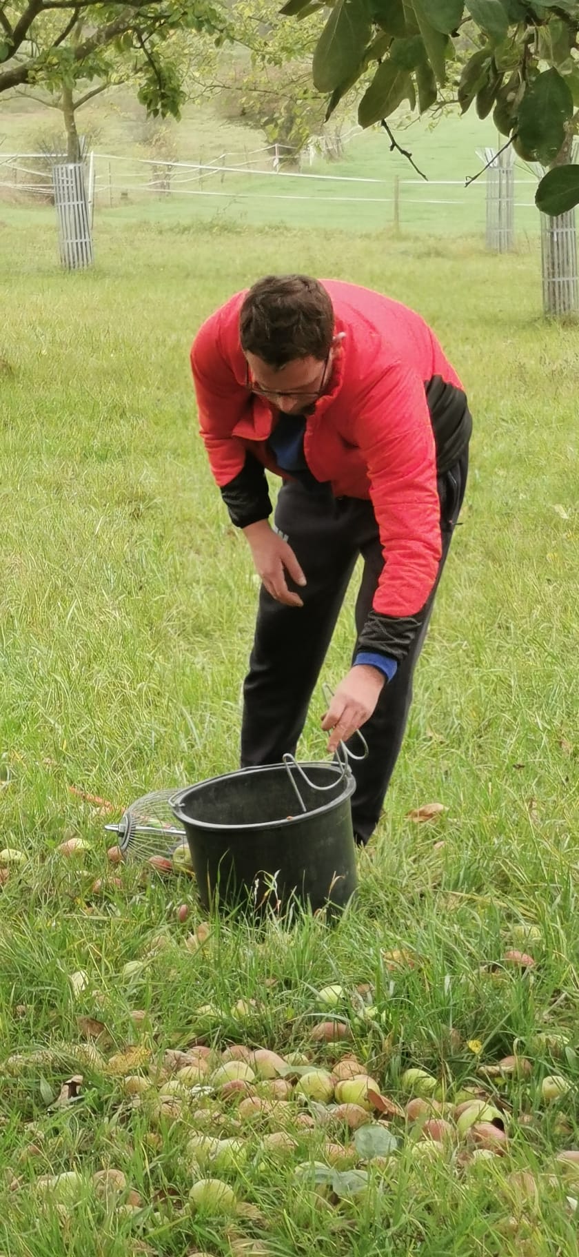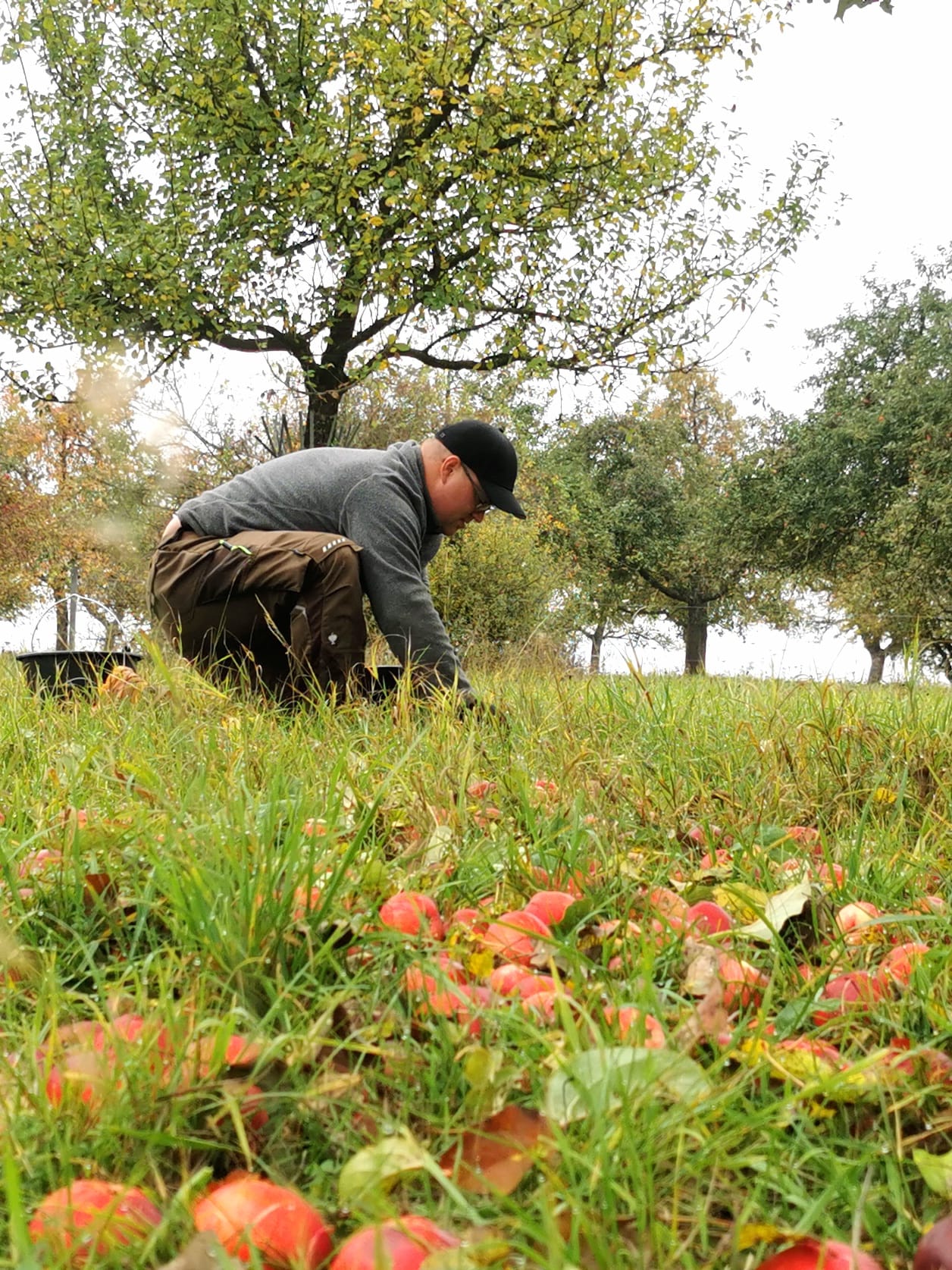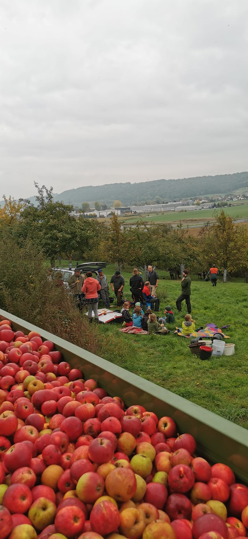 Eine Begrenzung war festgelegt: "Nur" den Hänger vollladen, nicht mehr. Eine vierköpfige Gruppe hatte schon am Freitagnachmittag (11.10.2025) die Äpfel "abgeschüttelt". Und am Samstagvormittag fand sich eine große Zahl Helfer zusammen, von kleinen Kindern über junge Mütter und Väter sowie weiteren im Lebensmittelpunkt befindlichen Menschen bis zu den "alten" Aktiven von 59 Jahren aufwärts. Trotz intensiven Arbeitens fand sich genügend Zeit für Gespräche (und natürlich auch Lästereien) untereinander. Also alles entspannt. Alles? Da gab es einen Termin, an dem die vorbestellten Familienpizzen (wer möchte auch Familienpizzas) frühestens abzuholen waren. Und bis dahin war es noch ein Weilchen. Kurzerhand wurde nach der beendeten Lese auf der Taufwiese noch einige Eimer (pro Person) Apfellese auf der Hardtwiese vorgeschlagen und beschlossen. Und siehe da: Der Pizzaabholtermin wurde erreicht und die Apfelernte endete mit gemütlichen (teilweise "technisch anspruchsvollen") Pizzaessen. Wenige Personen mussten zum "Feierabend extra aufgefordert" werden. Also alles entspannt.