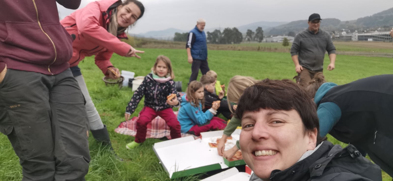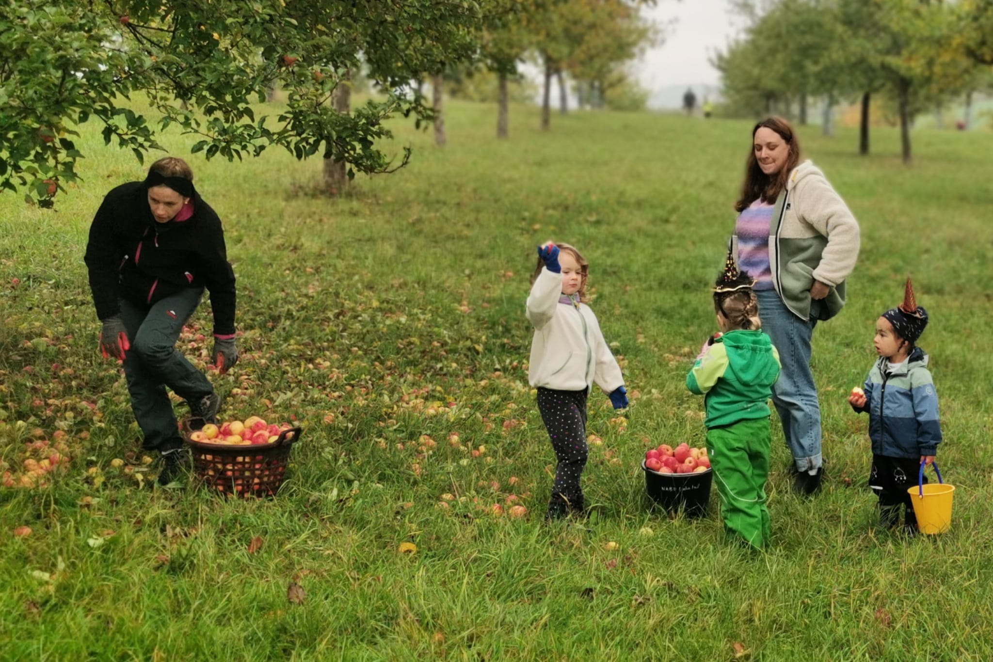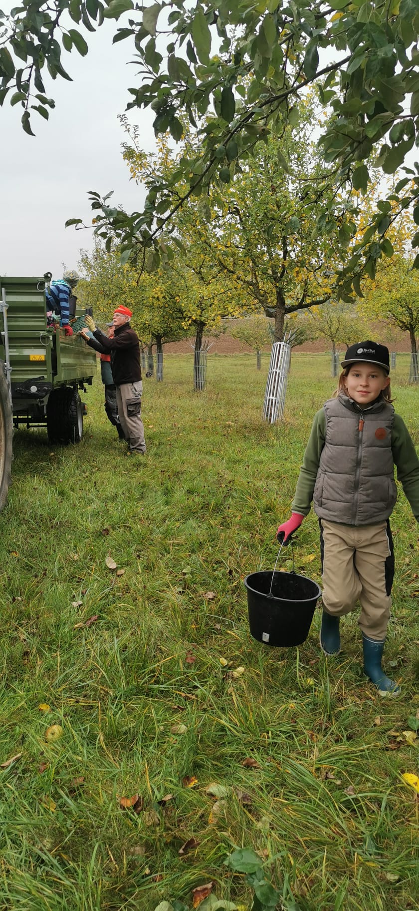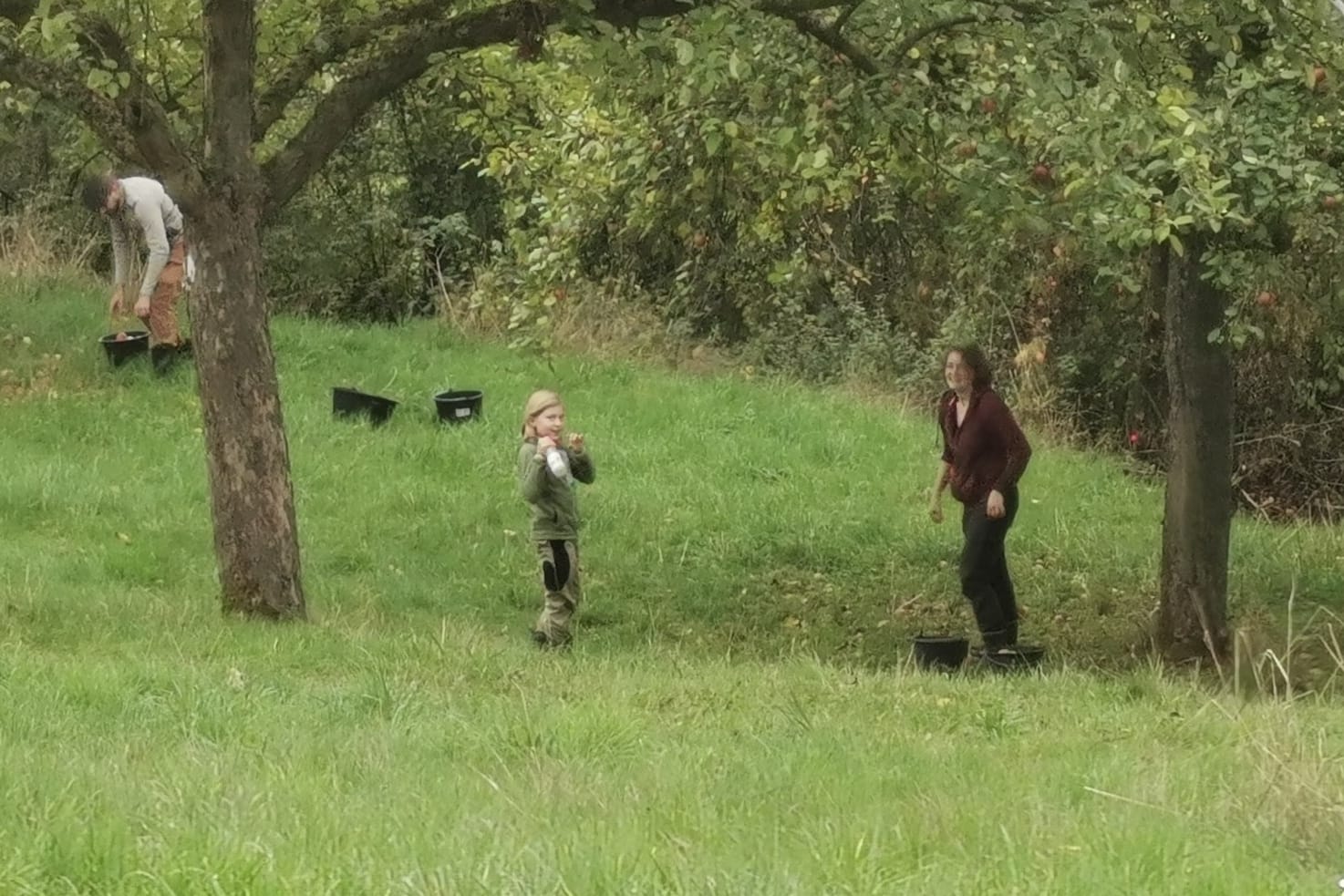 Eine Begrenzung war festgelegt: "Nur" den Hänger vollladen, nicht mehr. Eine vierköpfige Gruppe hatte schon am Freitagnachmittag (11.10.2025) die Äpfel "abgeschüttelt". Und am Samstagvormittag fand sich eine große Zahl Helfer zusammen, von kleinen Kindern über junge Mütter und Väter sowie weiteren im Lebensmittelpunkt befindlichen Menschen bis zu den "alten" Aktiven von 59 Jahren aufwärts. Trotz intensiven Arbeitens fand sich genügend Zeit für Gespräche (und natürlich auch Lästereien) untereinander. Also alles entspannt. Alles? Da gab es einen Termin, an dem die vorbestellten Familienpizzen (wer möchte auch Familienpizzas) frühestens abzuholen waren. Und bis dahin war es noch ein Weilchen. Kurzerhand wurde nach der beendeten Lese auf der Taufwiese noch einige Eimer (pro Person) Apfellese auf der Hardtwiese vorgeschlagen und beschlossen. Und siehe da: Der Pizzaabholtermin wurde erreicht und die Apfelernte endete mit gemütlichen (teilweise "technisch anspruchsvollen") Pizzaessen. Wenige Personen mussten zum "Feierabend extra aufgefordert" werden. Also alles entspannt.