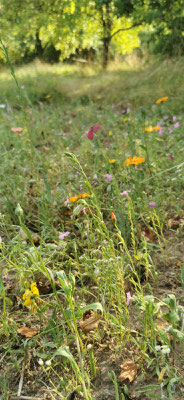 Die zwei am 24.5.2025 auf dem Kindergrundstück mit Wildblumensamen eingesäten Flächen haben sich sehr unterschidlich entwickelt. Auf der 2. Fläche hat sie ein "kämpfendes Pflänzchen" entdeckt. Die erste Fläche besticht durch Vielfalt, die beim Vergrößern des Fotos erst deutlich sichtbar wird.