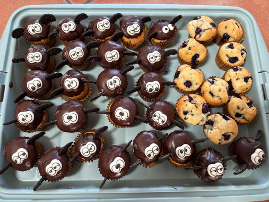 Nach dem Zeltaufbau stärkten wir uns mit einem leckeren Snack: Fledermaus-Muffins, Zitronen-Muffins, veganer Bananenkuchen, Kaffee und Apfelsaft warteten auf uns. Ein großes Dankeschön gilt den