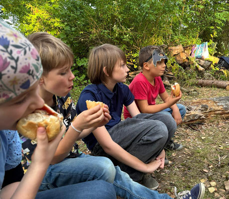 Als das Feuer knisternd entfacht war, wartete ein leckeres Abendessen auf uns: knusprig gegrillte Würstchen im Brötchen und in der Glut gegarte Kartoffeln, die mit Kräuterbutter besonders